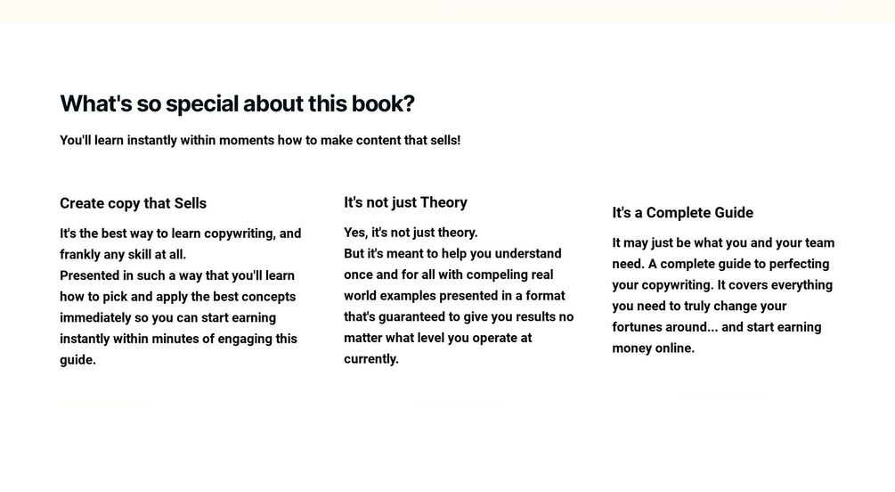 A complete guide to perfecting your copywriting. It covers everything you need to truly change your fortunes around through your sales pitch.